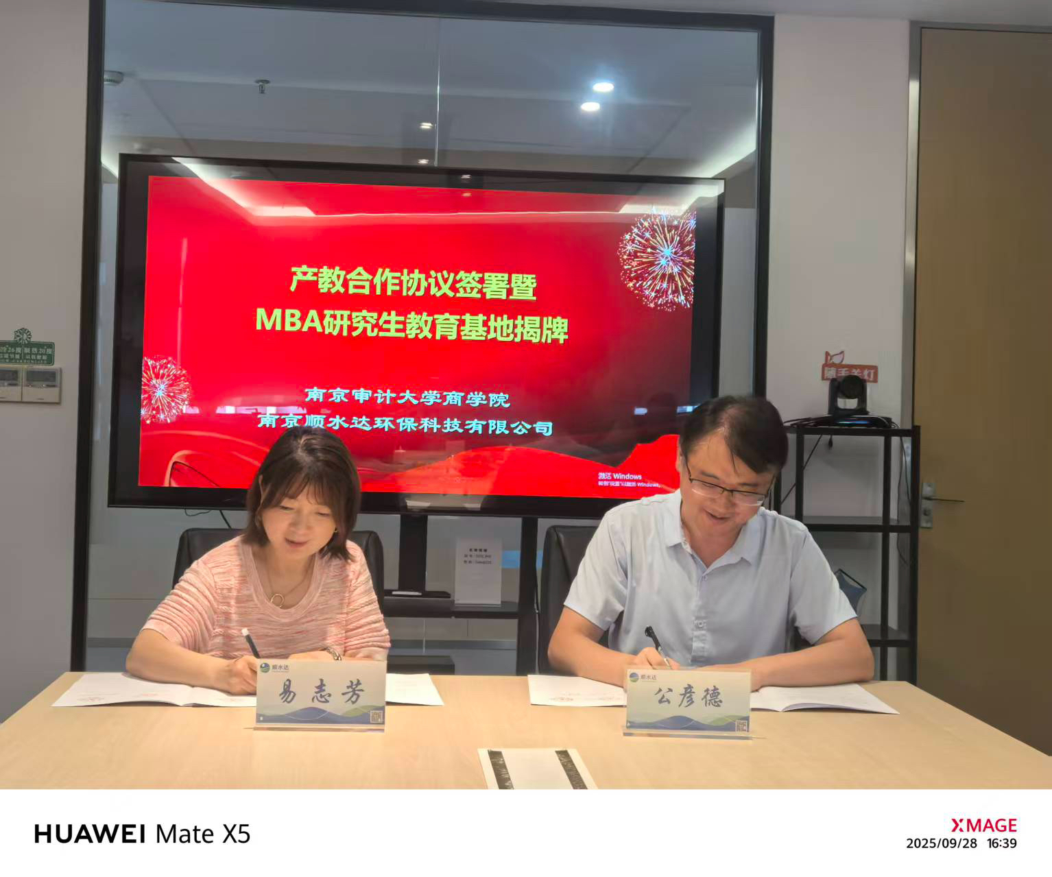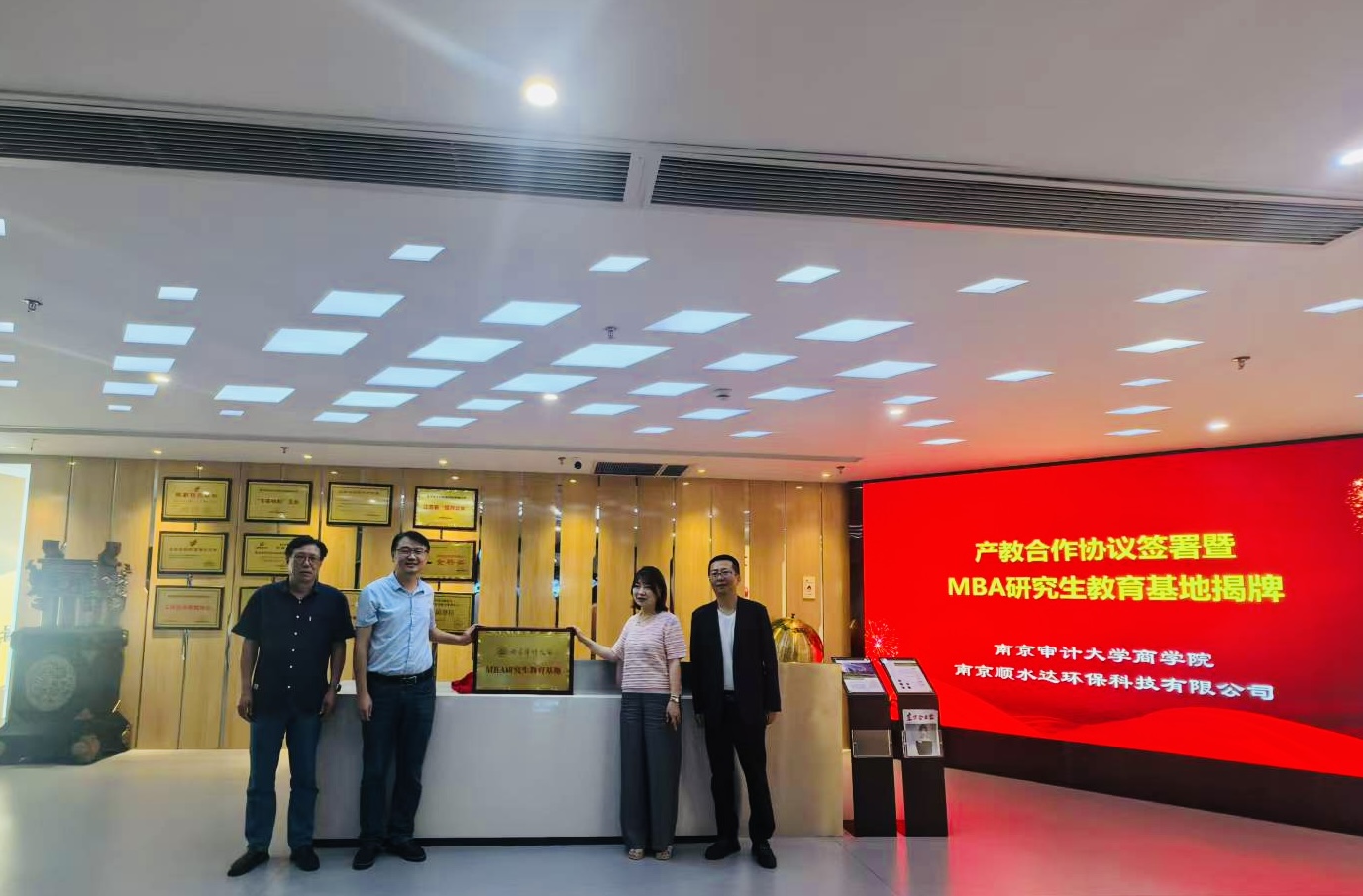 为积极拓展校企合作,充分发挥校企双方的资源优势,实现共赢发展,9月28日,商学院党委书记公彦德教授一行3人前往南京顺水达环保科技有限公司(以下简称顺水达),签署产教合作协议并为“南京审计大学MBA研究生教育基地”揭牌。