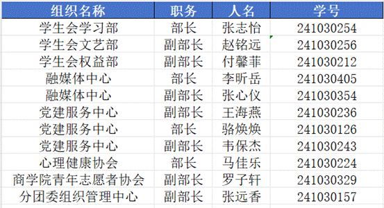 为进一步完善商学院团学联体系,根据《关于商学院团学联部长团选聘通知》《关于商学院团学联部长团补聘通知》要求,依据《南京审计大学学生干部任用管理办法》《南京审计大学学院团委成立工作实施方案》等文件所传达的相关精神和要求,商学院团委组织开展了团学联部长补聘工作。商学院团委本着公平、公正、公开的原则,经过个人报名、面试考核、聘选小组综合评议、学院团委审查等环节,拟聘张志怡等11名同学为商学院团委与特色学生组织部长、副部长(名单附后),现将具体名单公示如下。