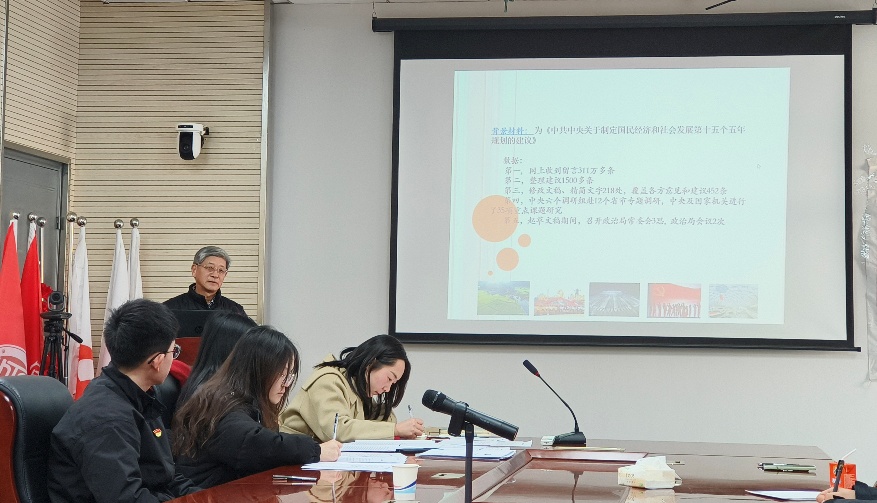 2025年12月29日下午,南京审计大学商学院于竞慧西楼401会议室开展“党的二十届四中全会精神”专题党课。本次党课围绕《中共中央关于制定国民经济和社会发展第十五个五年规划的建议》及青年党员使命担当,由特邀组织员邓欣副教授主讲,商学院专职组织员杨峥主持,本科生党支部书记、本科生党员和研究生党员代表参加。